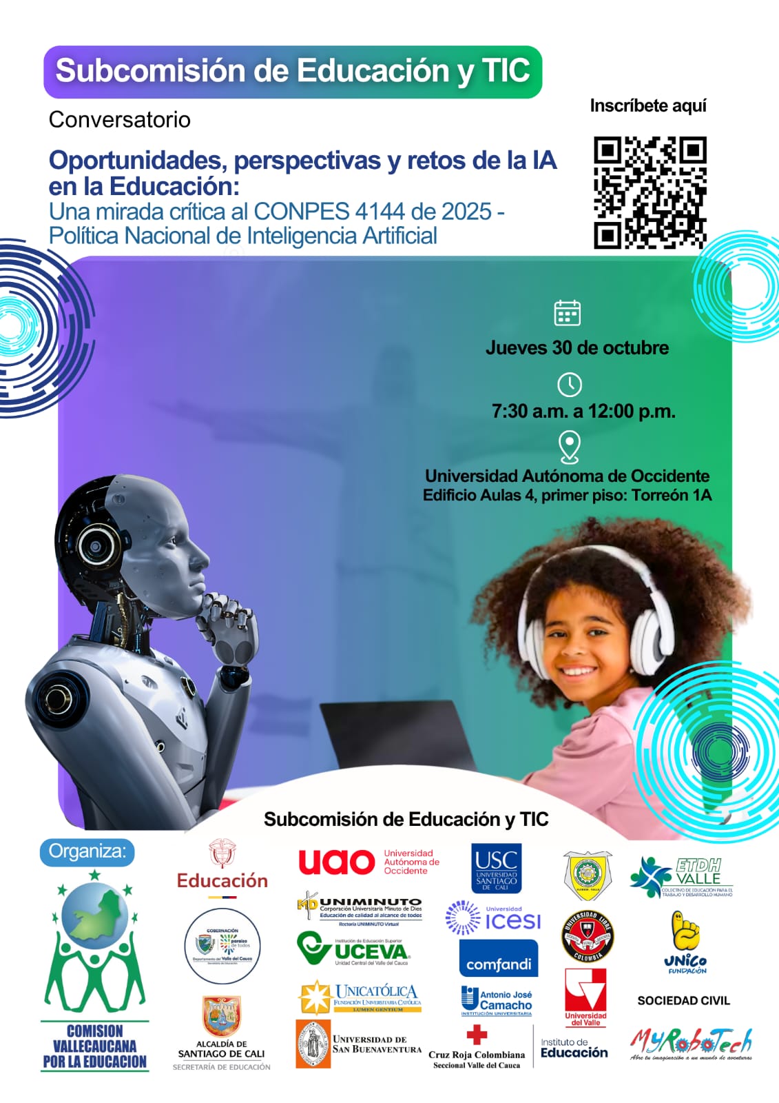 La Comisión Vallecaucana por la Educación, desde la Subcomisión de Educación y TIC, te invitan a inscribirte y participar en el Conversatorio Oportunidades, perspectivas y retos de la IA en la Educación: Una mirada critica al CONPES 4144 de 2025.